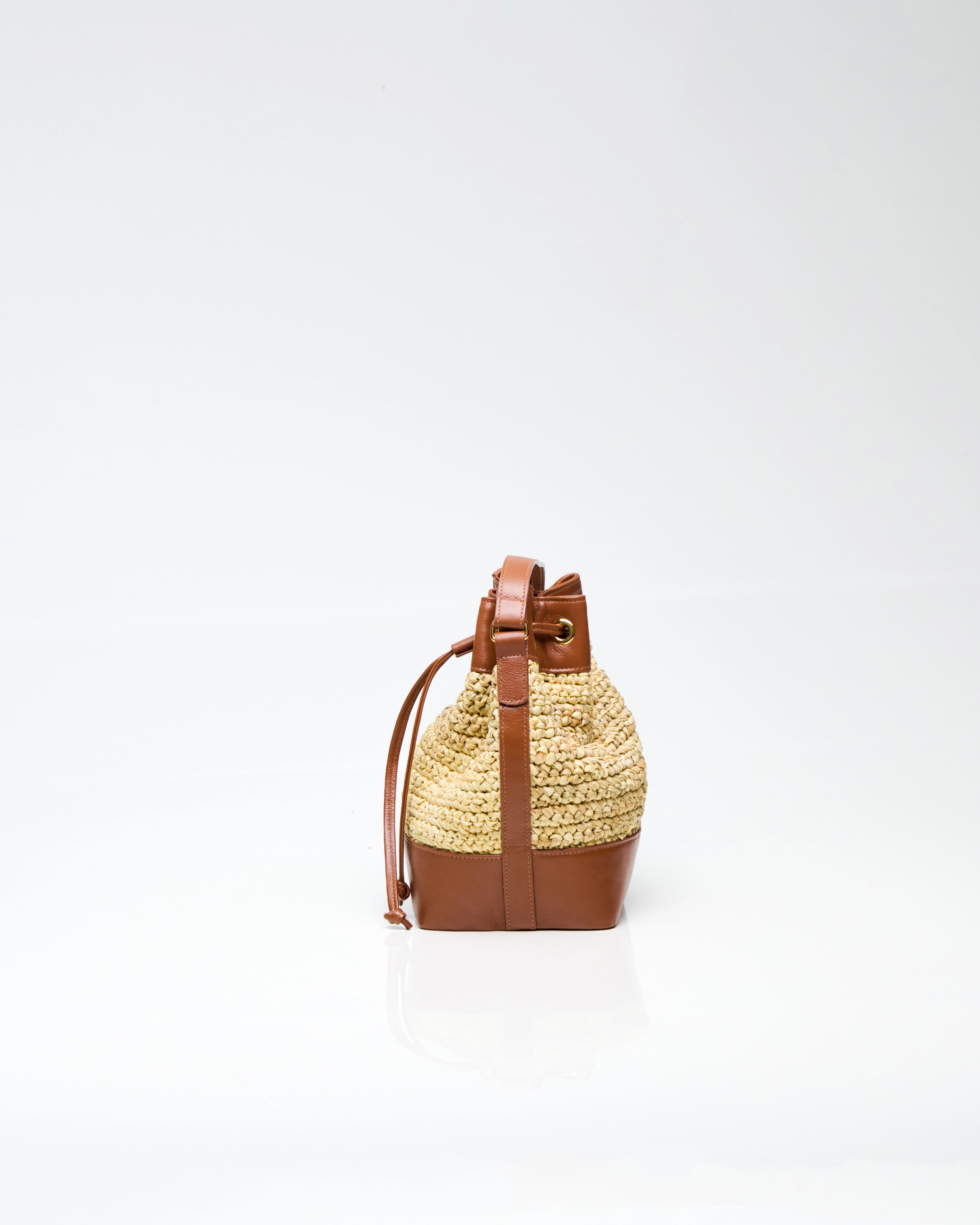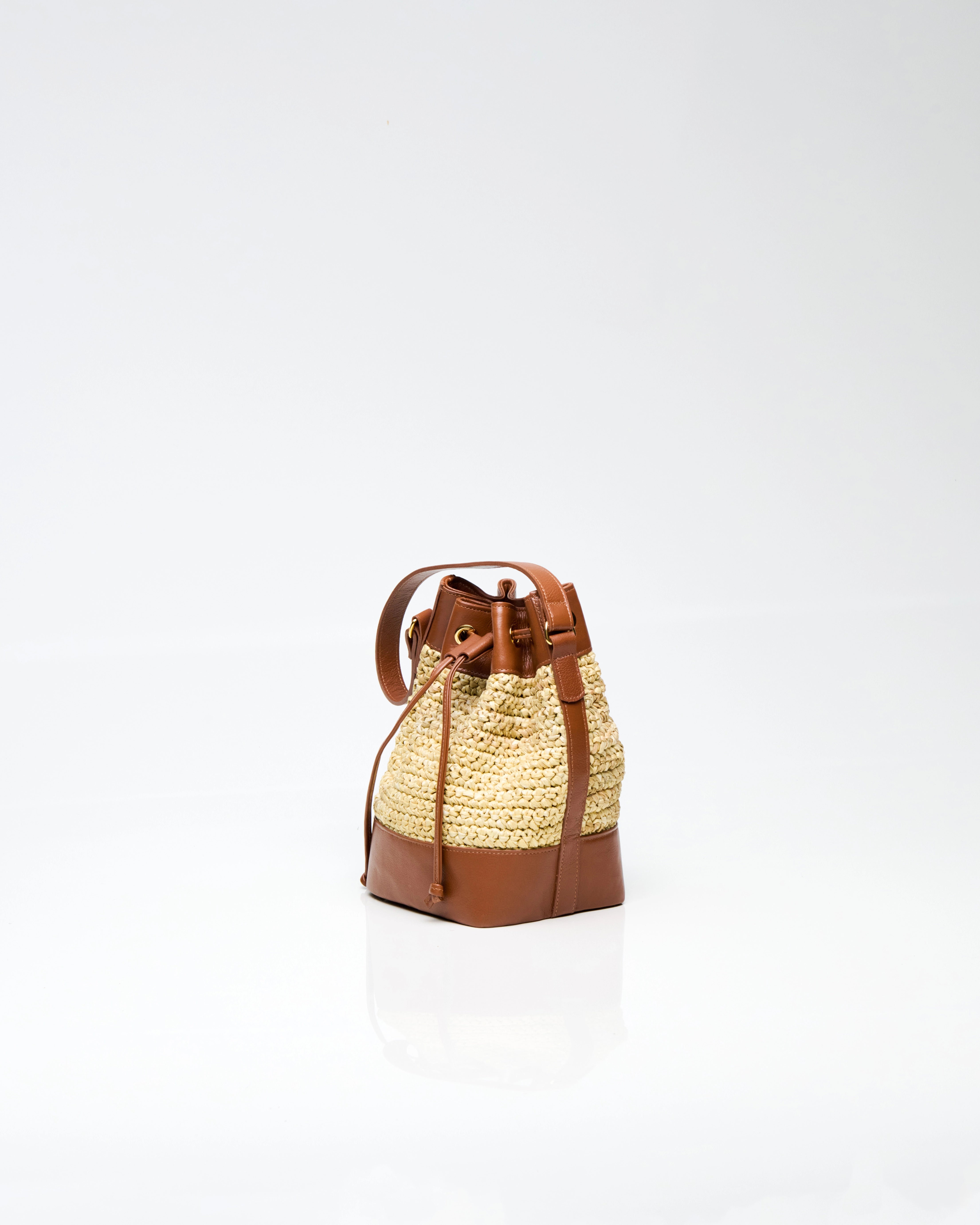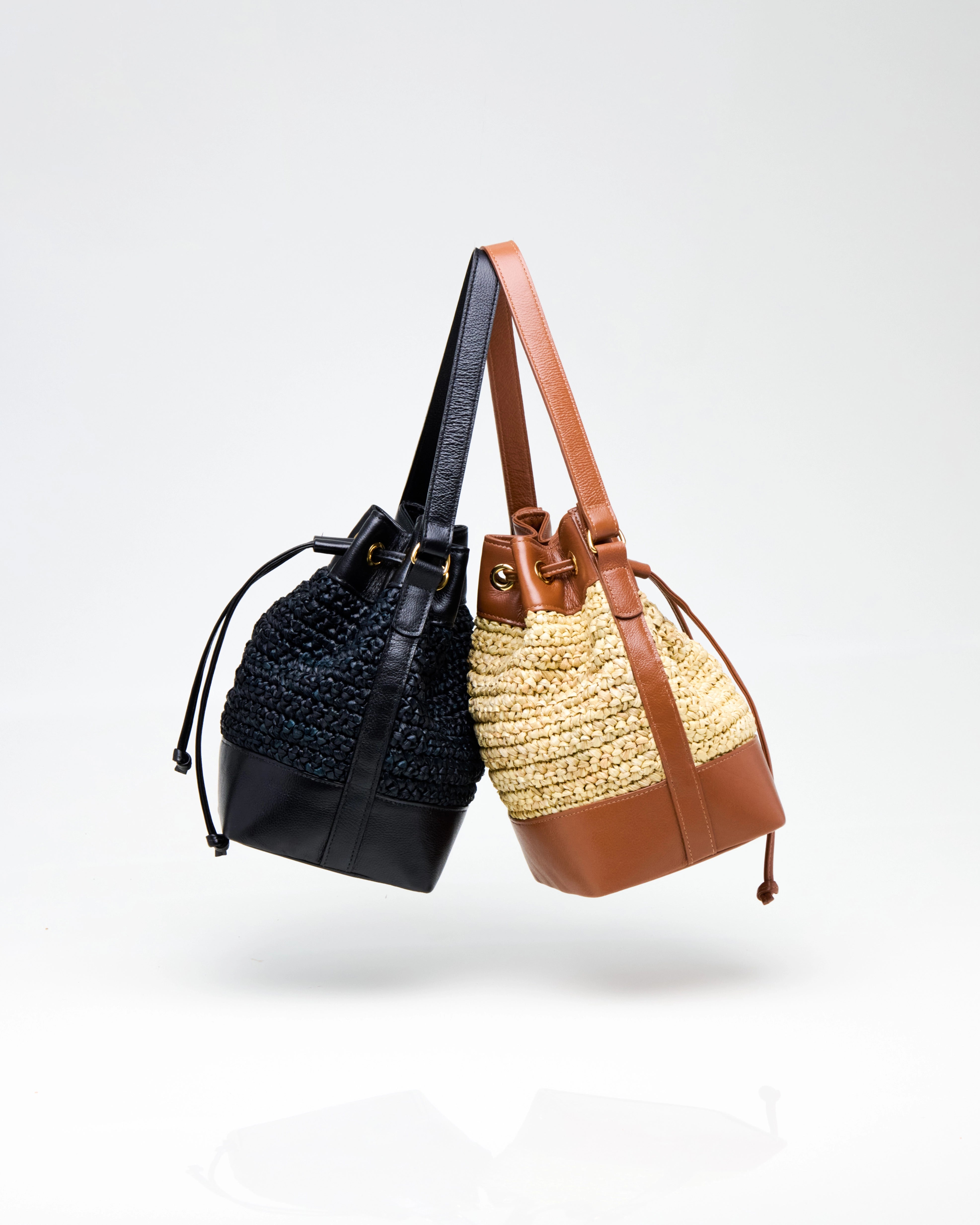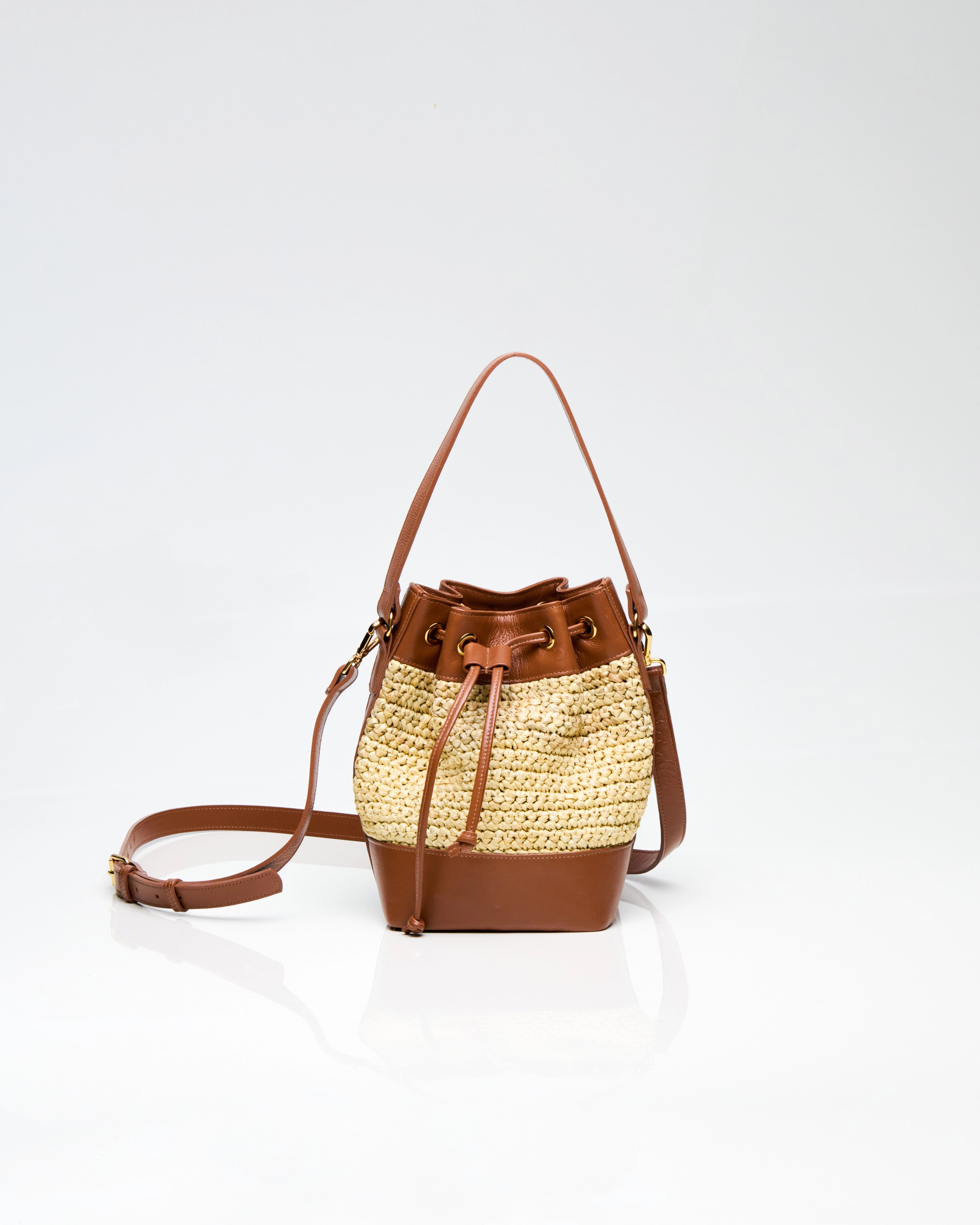 Bolsa bucket em couro e ráfia italiana: moderna, elegante e espaçosa. Ideal para passeios ou compromissos urbanos, combina estilo e praticidade.