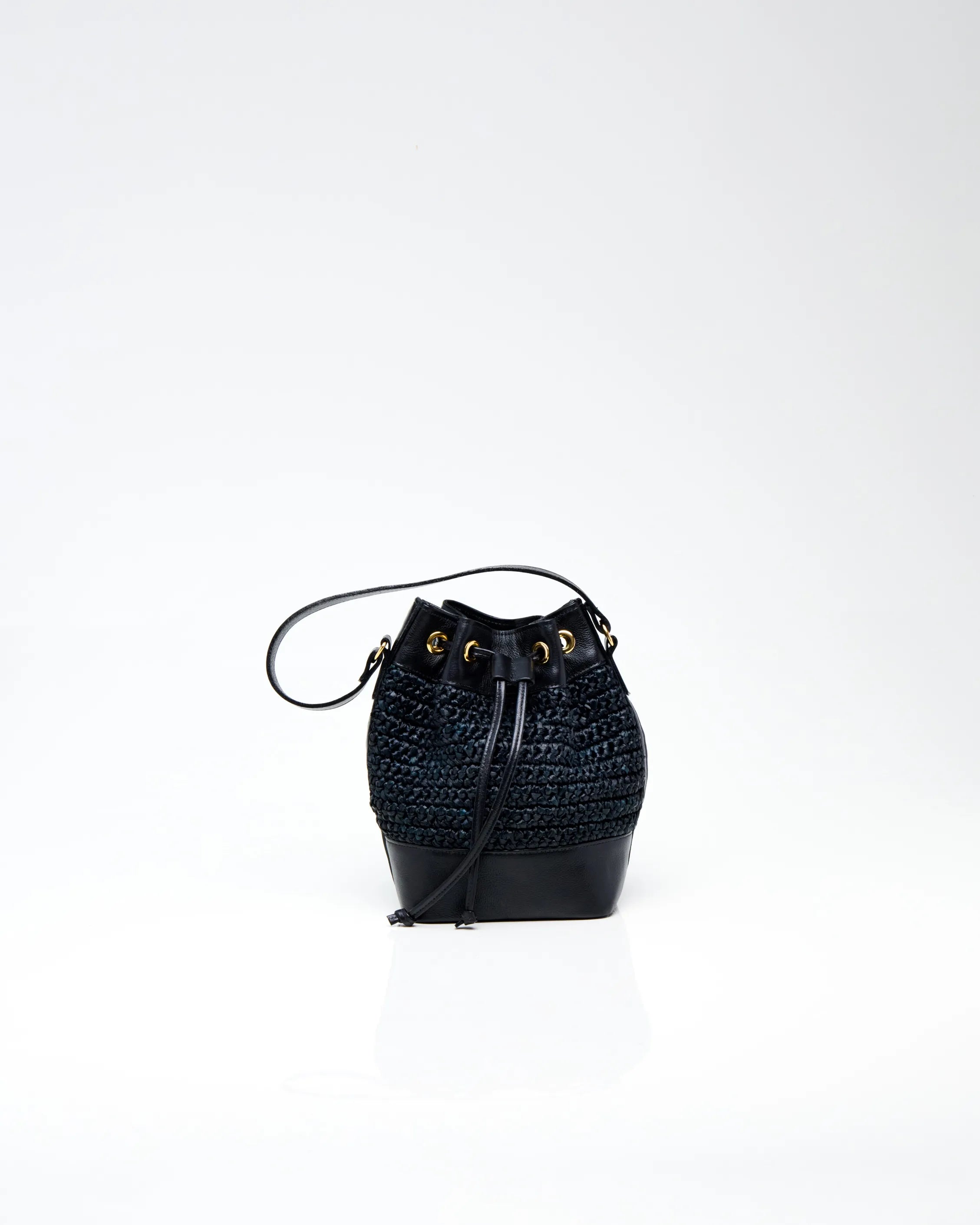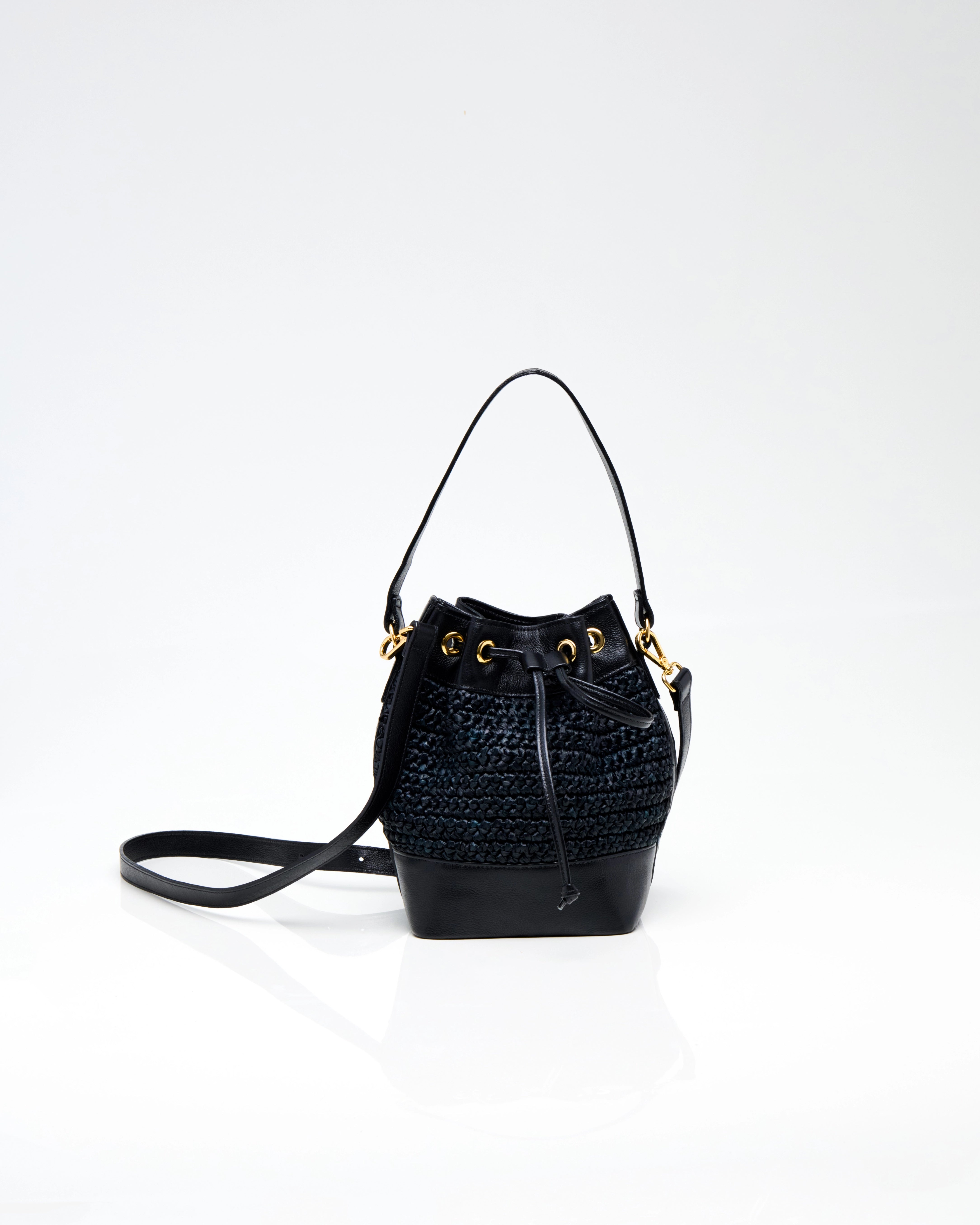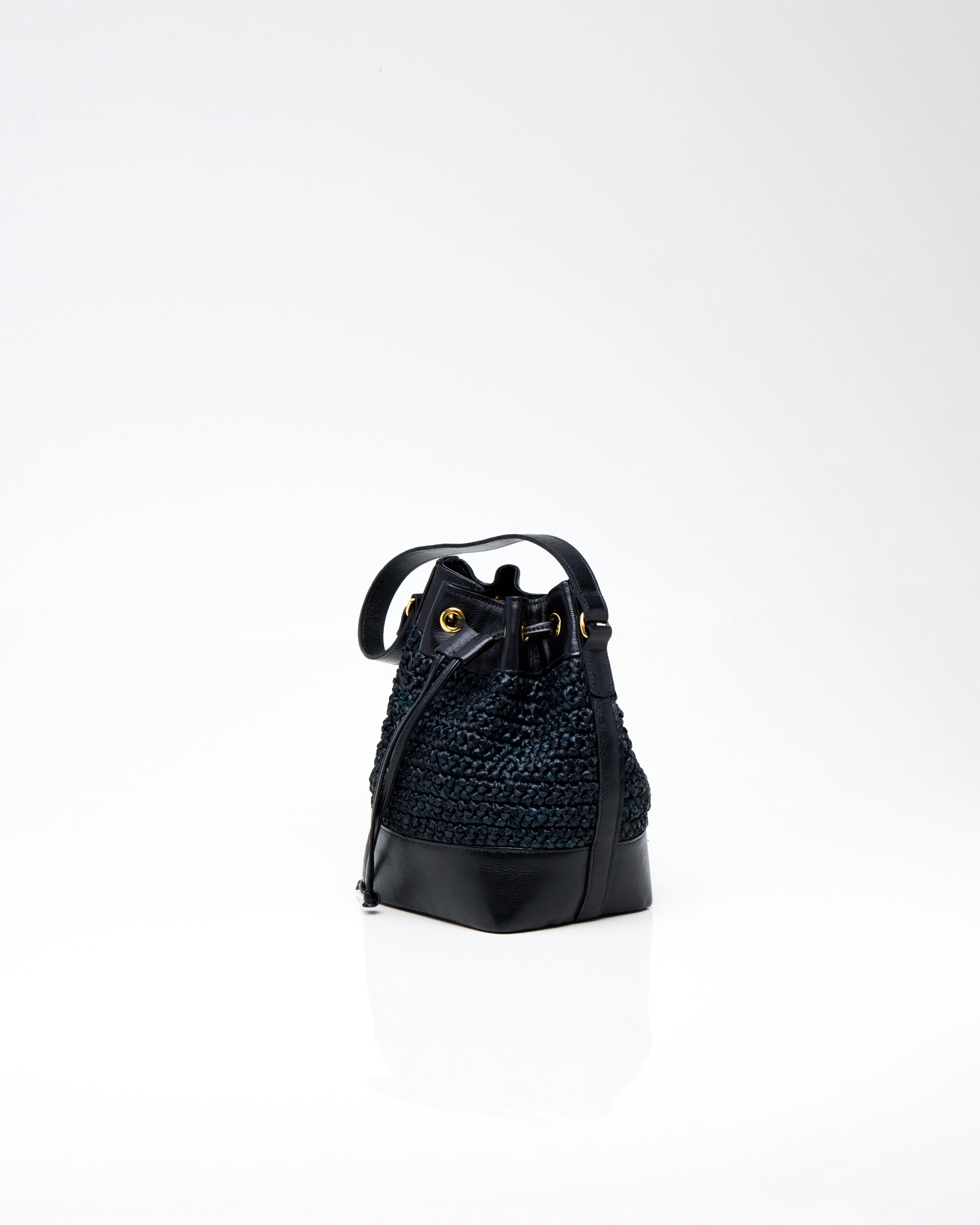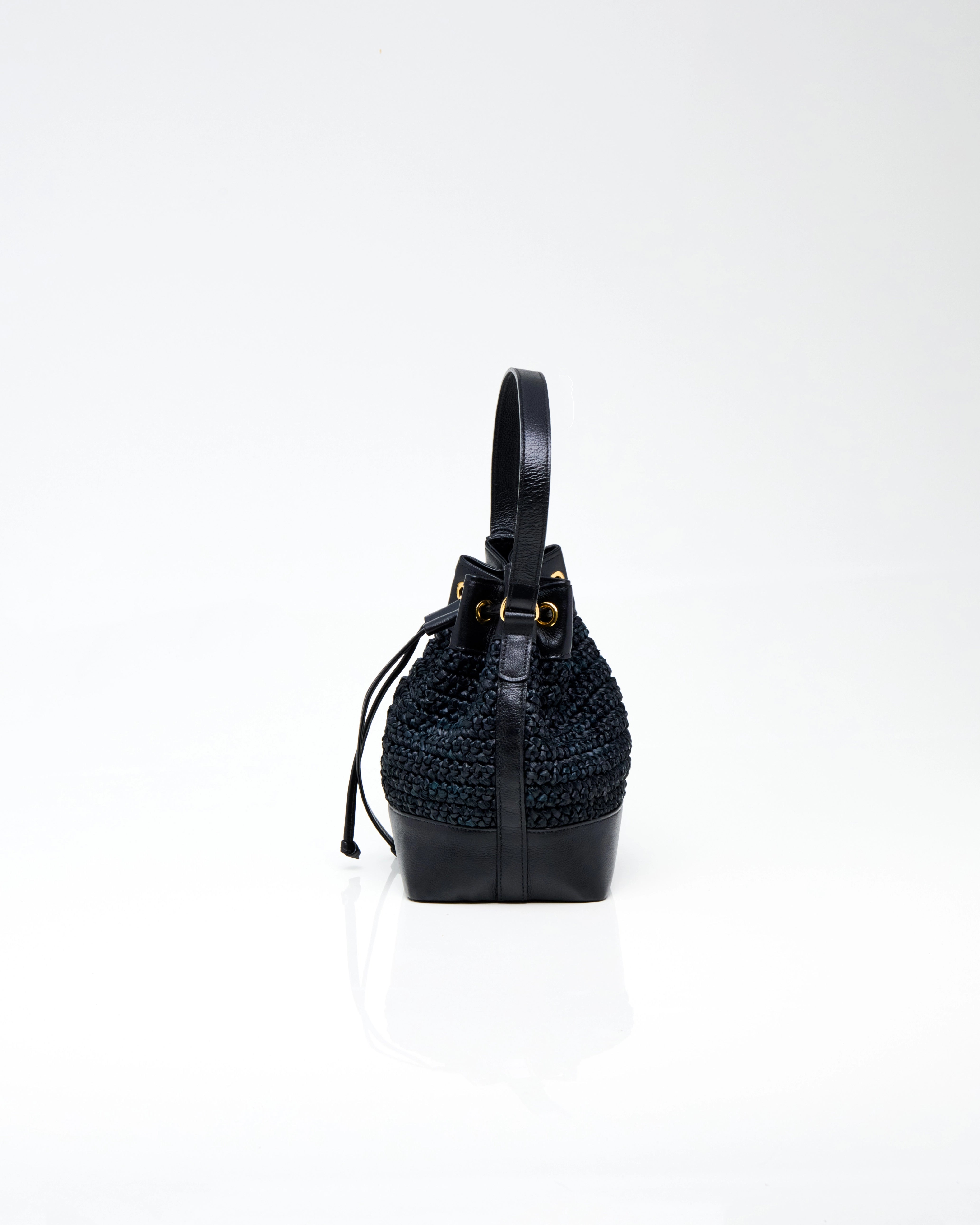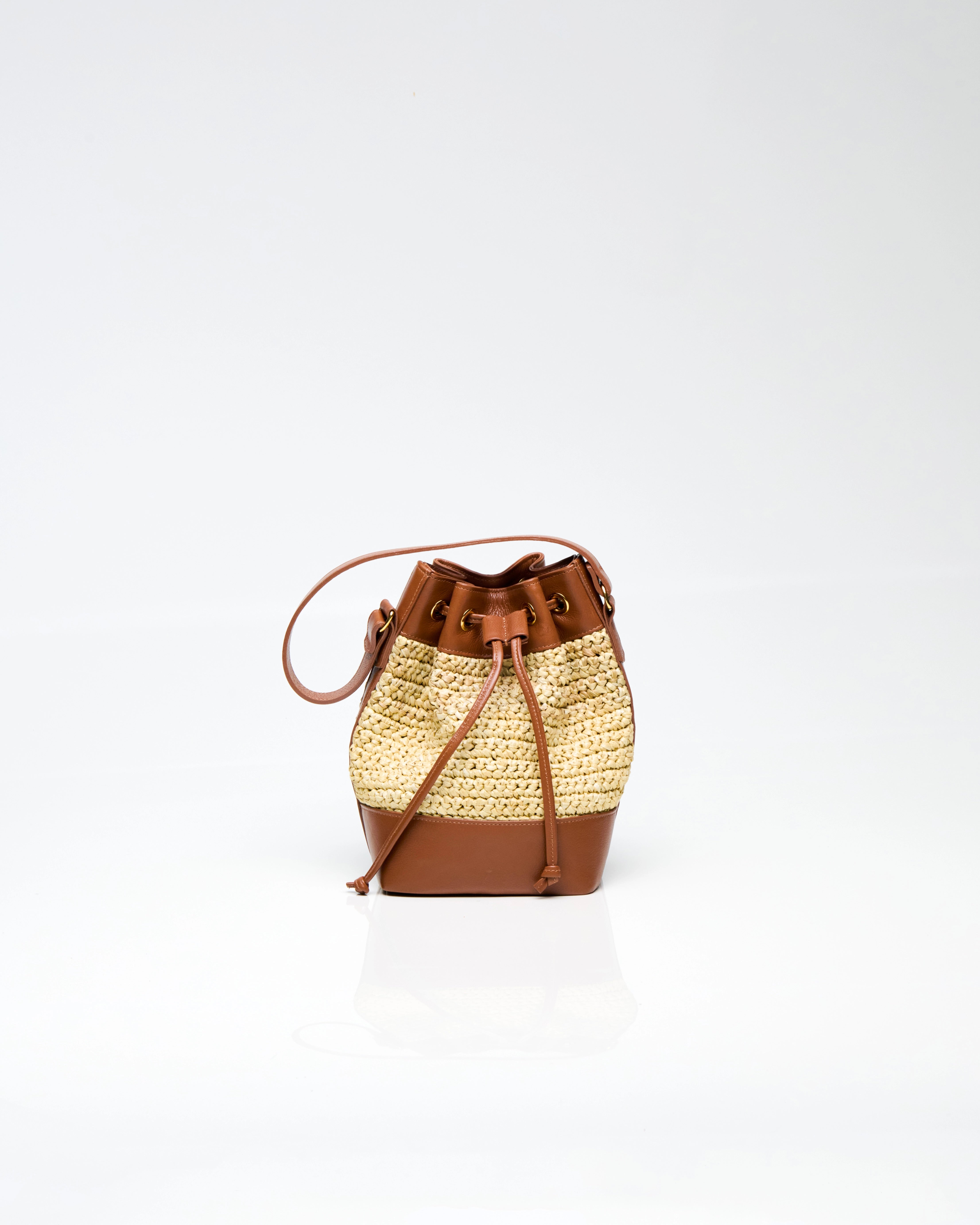 Bolsa bucket em couro e ráfia italiana: moderna, elegante e espaçosa. Ideal para passeios ou compromissos urbanos, combina estilo e praticidade.