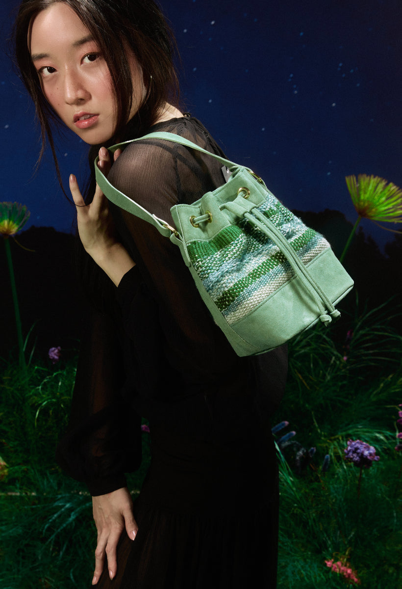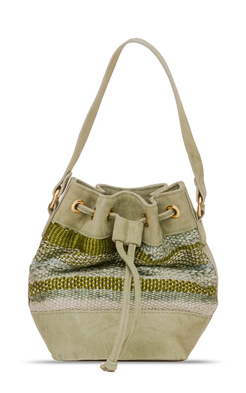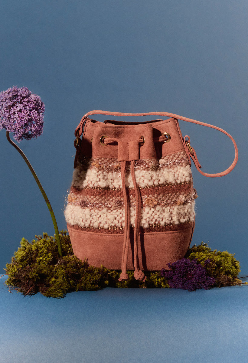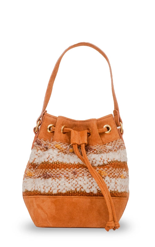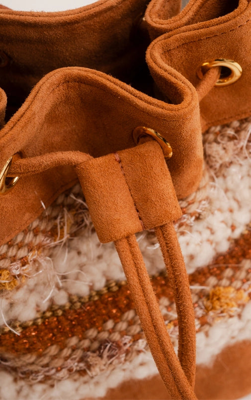 A bolsa Aura também veio para ficar. O formato bucket nunca sai de moda e é uma peça casual essencial quando se fala de bolsas. A nova verão compõe um trabalho manual em tear e camurça. Possui alça longa em camurça.