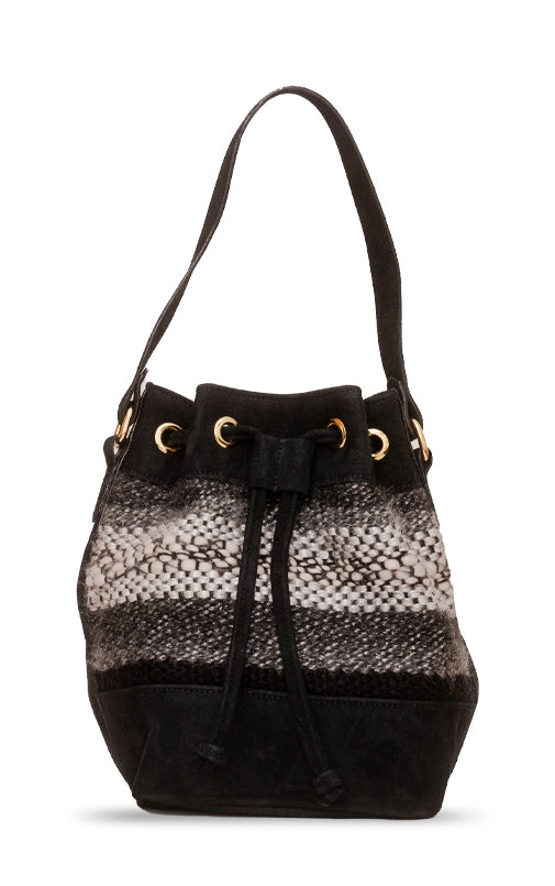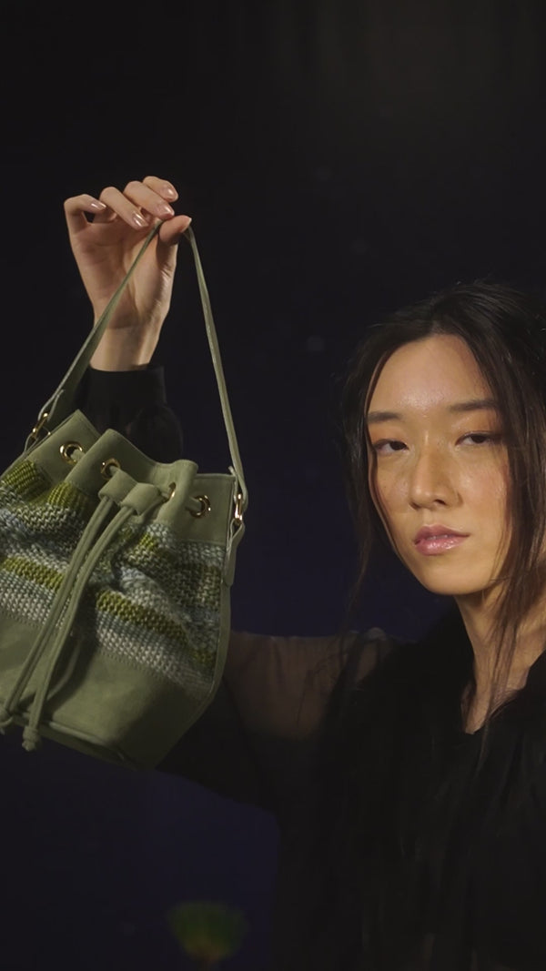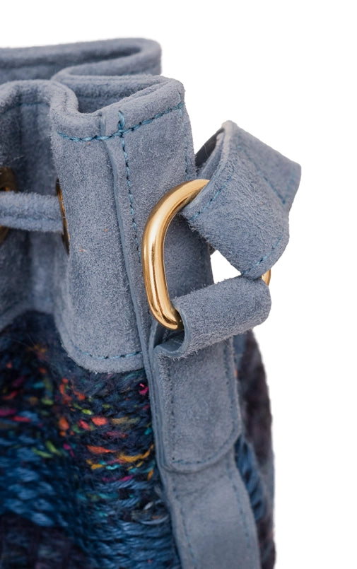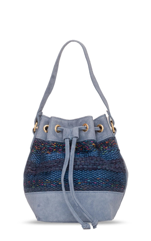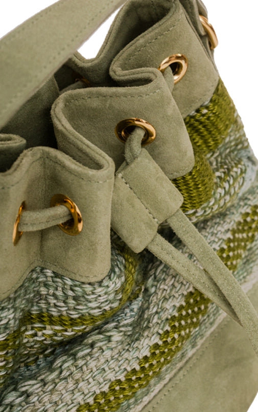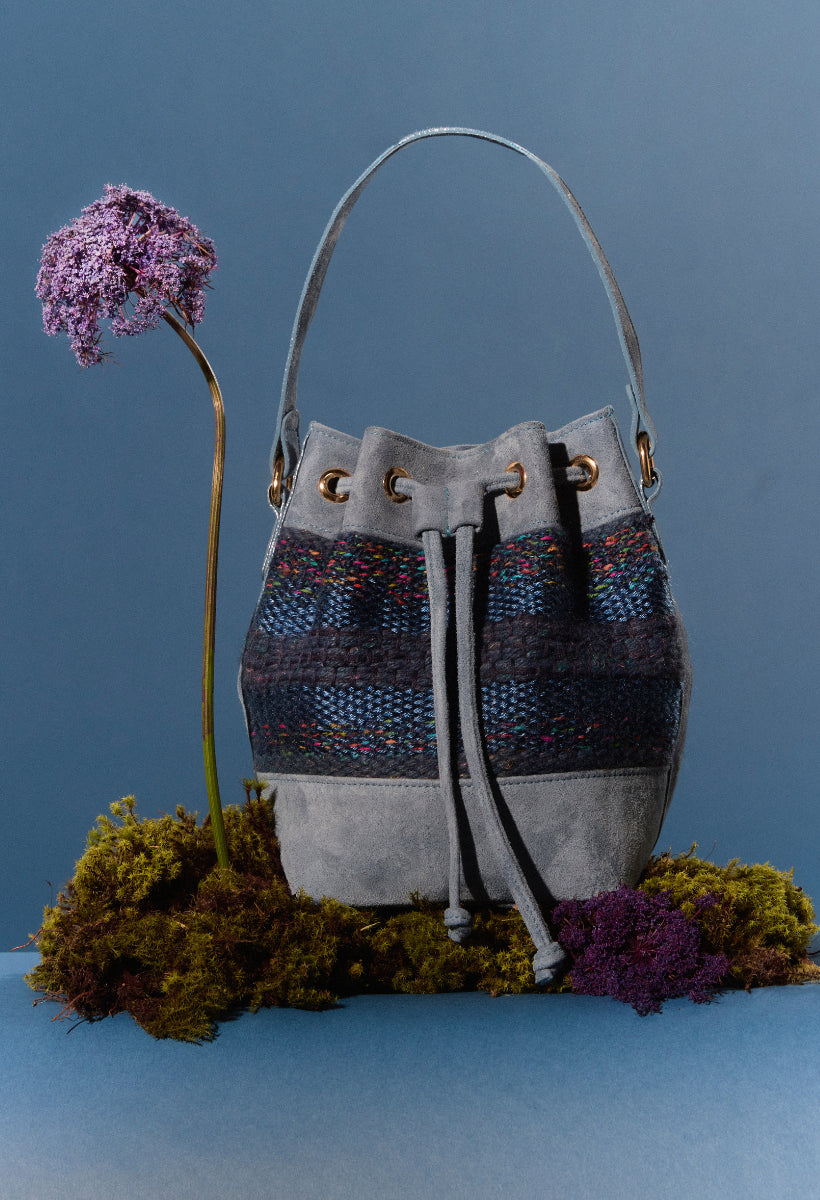A bolsa Aura também veio para ficar. O formato bucket nunca sai de moda e é uma peça casual essencial quando se fala de bolsas. A nova verão compõe um trabalho manual em tear e camurça. Possui alça longa em camurça.