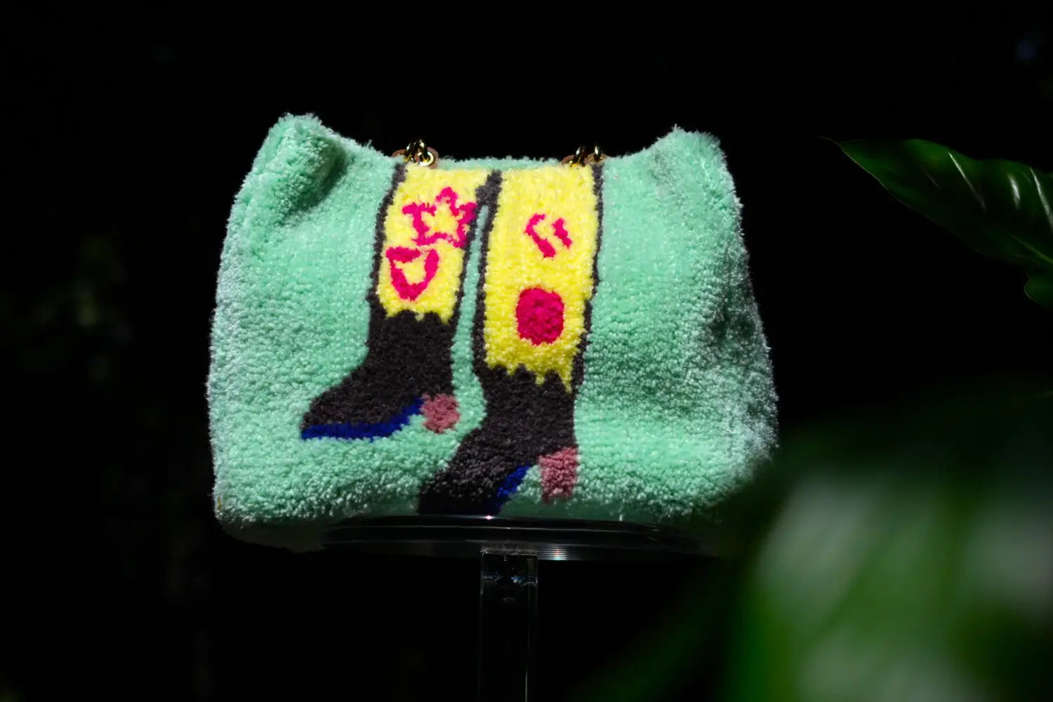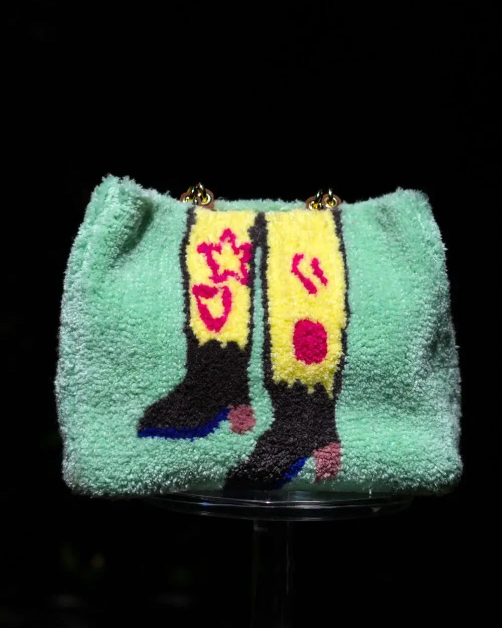 Bolsa Boots: maxi tote feita à mão em tufting, com estampa Verde Tiffany. Sofisticada e espaçosa, é perfeita para trabalho, viagens e passeios.