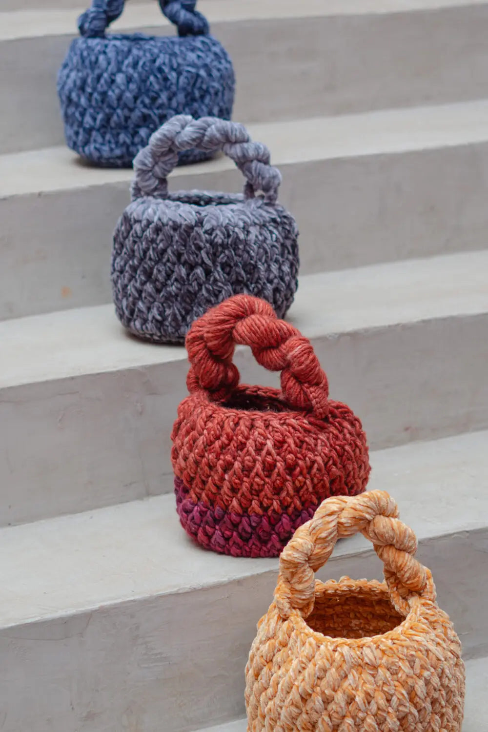 Bolsa Bucket, da Collab Pinga: feita à mão em crochê, disponível nas cores Blue, Grey, Mostard e Wine. Perfeita para eventos e passeios, de dia ou à noite.
