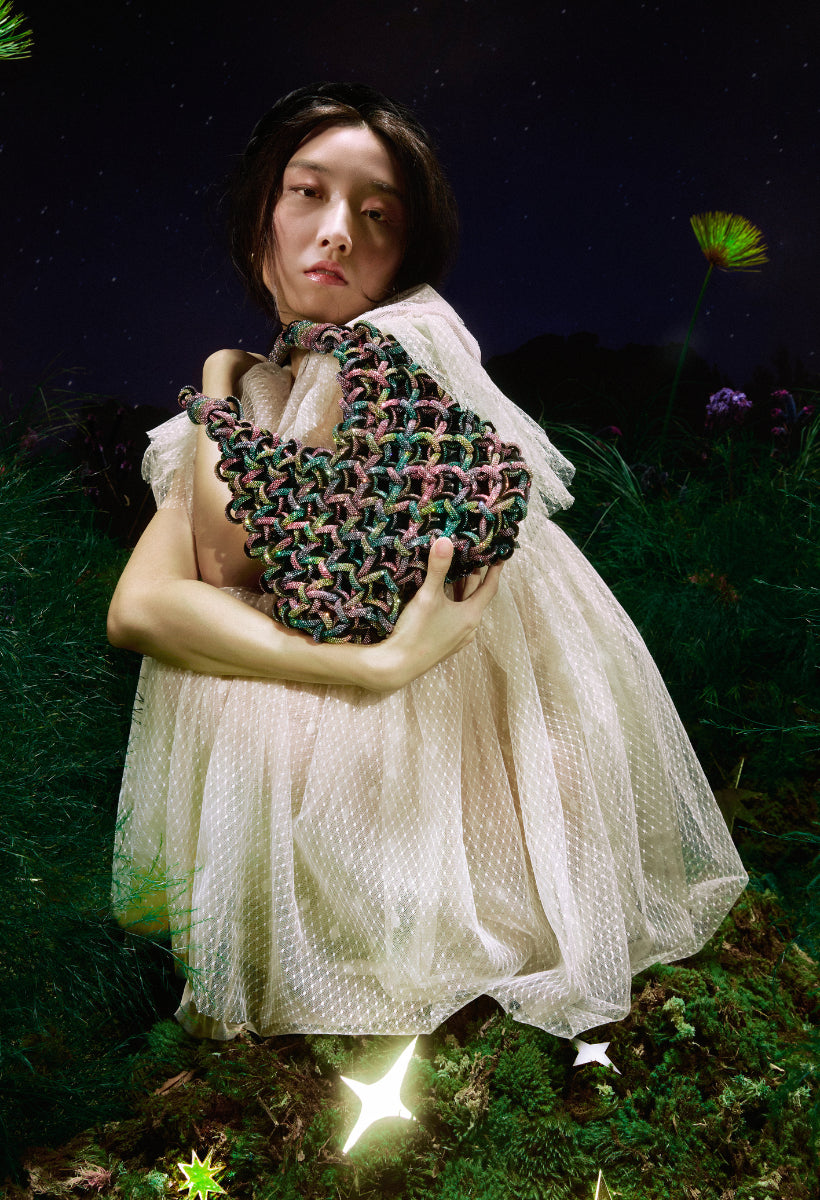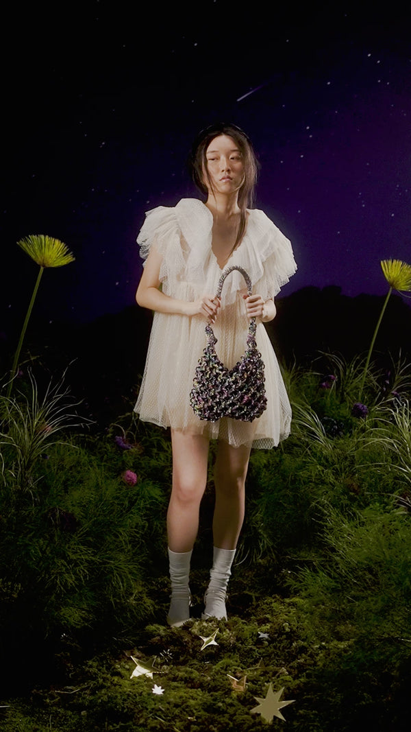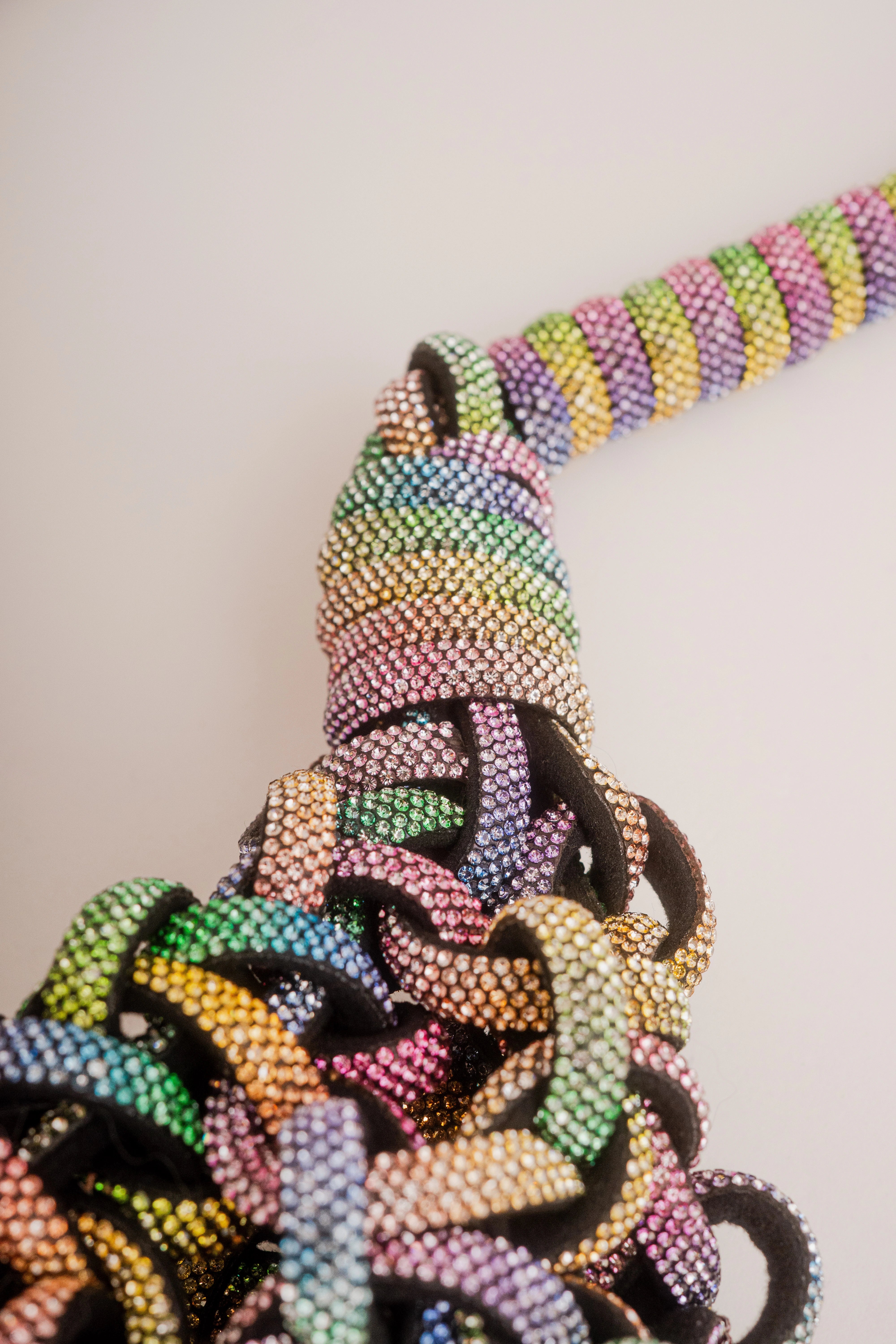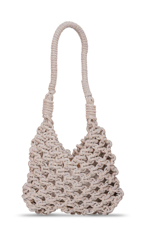 Uma nova versão da bolsa mais vendida da Mil Linhas. A Etoile brilho é uma bolsa maior que a versão original, trazendo mais espaço e estrutura para a peça. Foi desenvolvida em tiras metade cristal e metade couro trançadas `a mão de maneira a criar um efeito de ilusão de ótica.