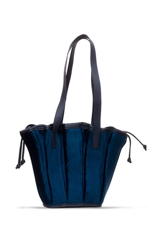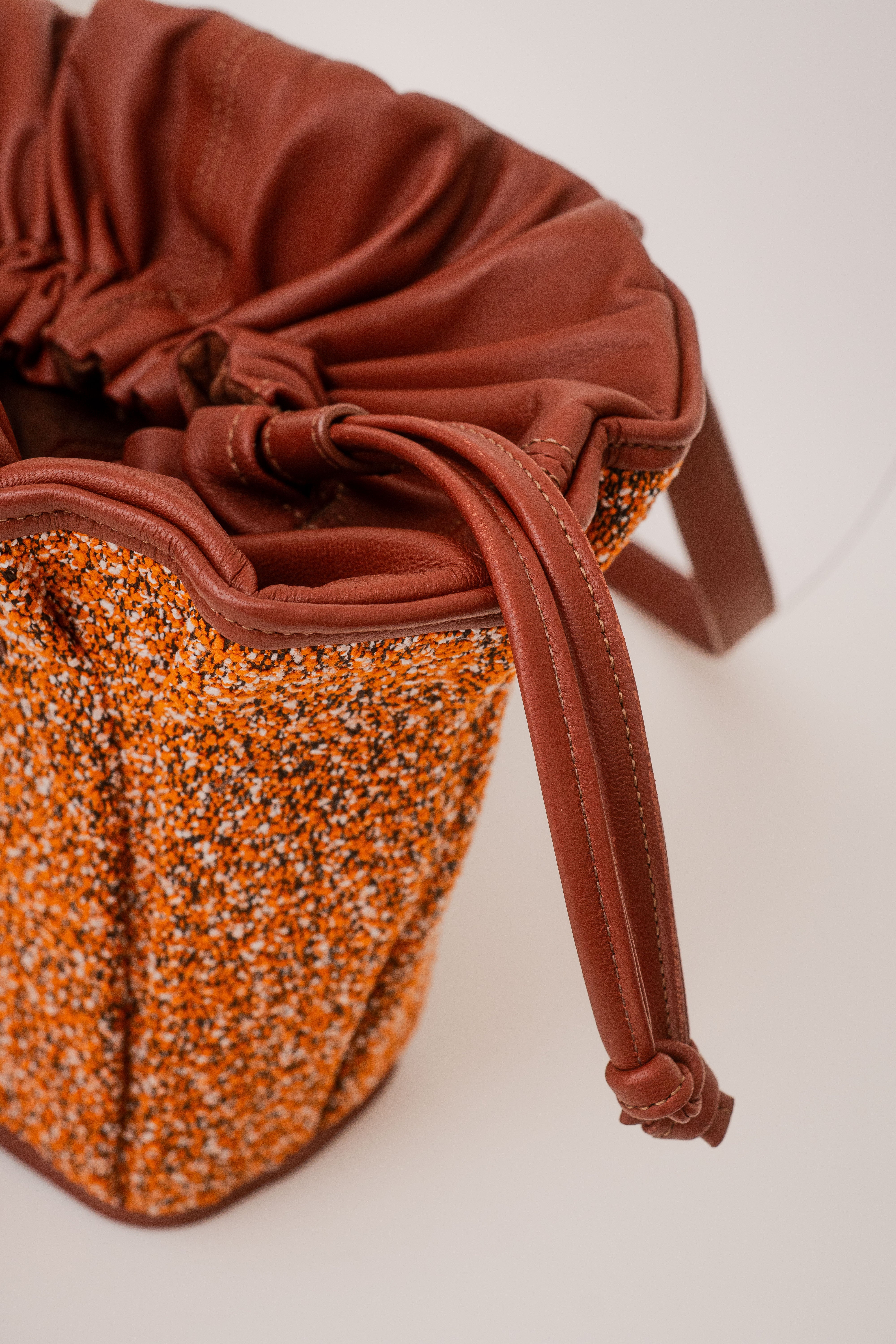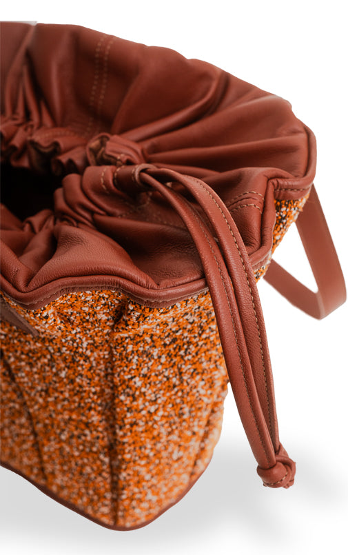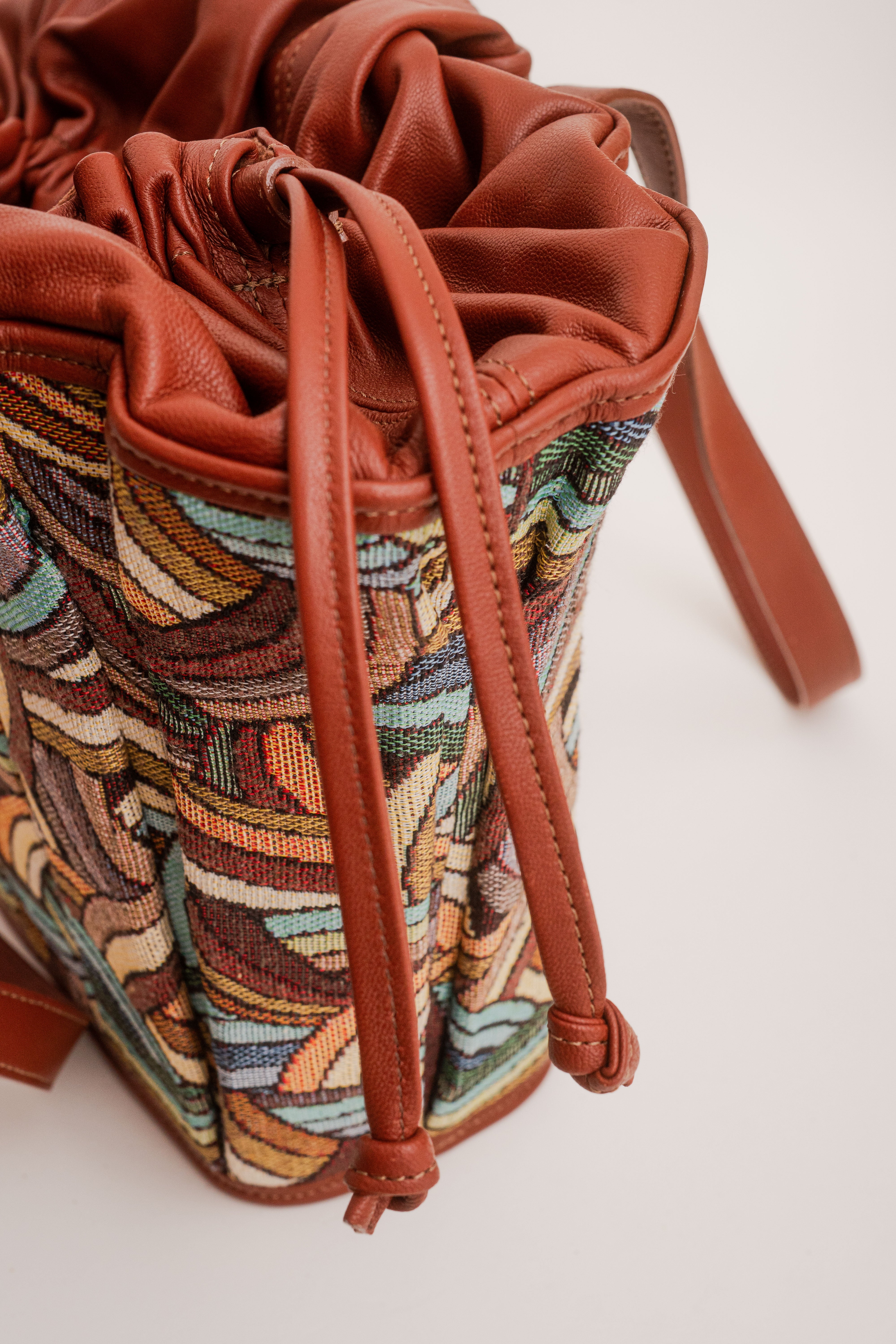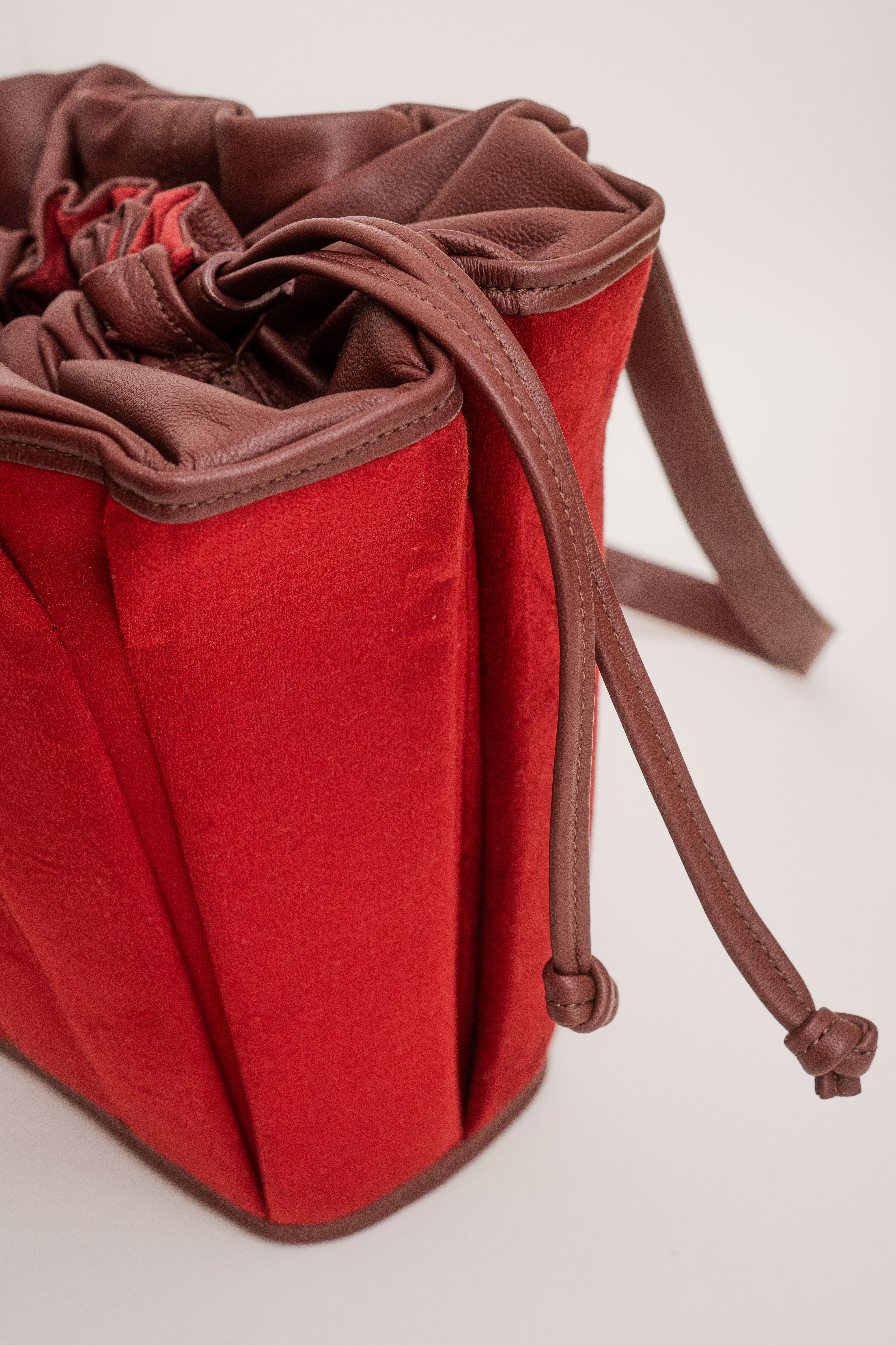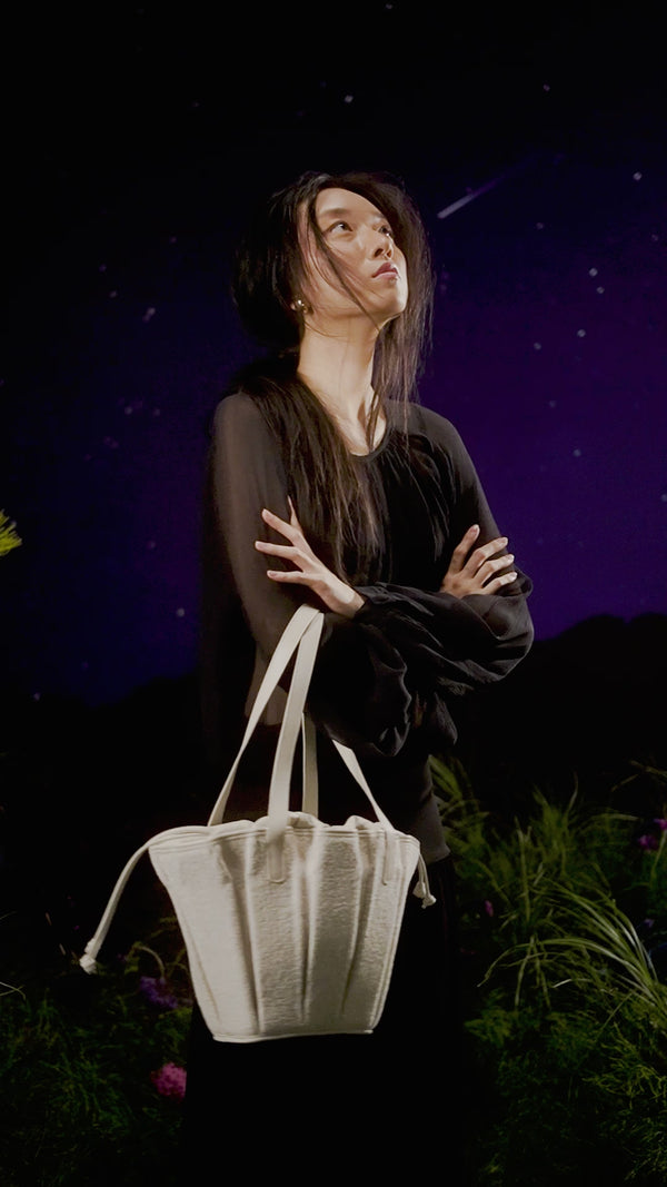 A bolsa Space possui um formato que lembra um pequeno guarda-chuva devido ao trabalho feito `a mão de dobradura. É uma peça sofisticada devido a mistura de materiais nobres e também extremamente criativa.