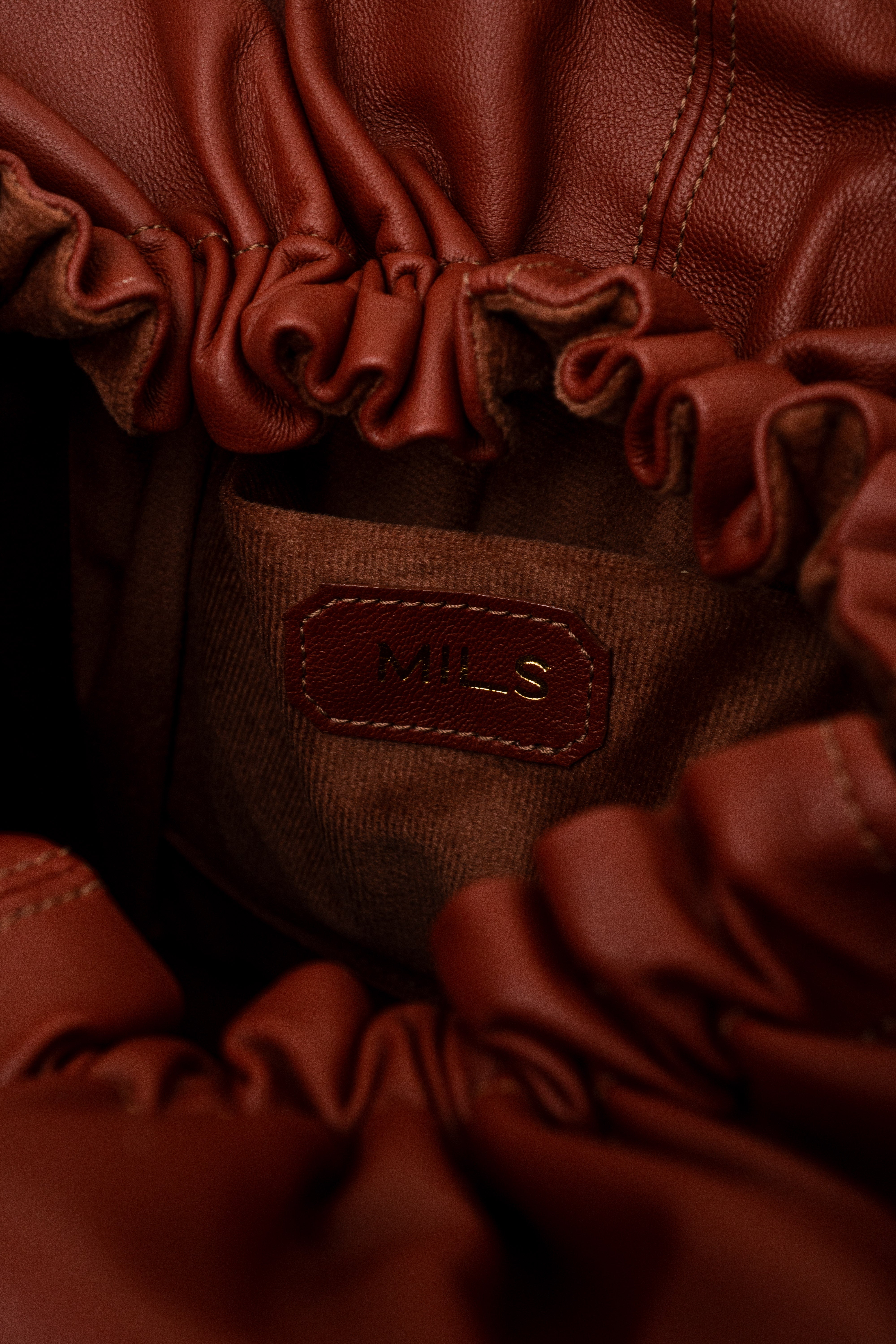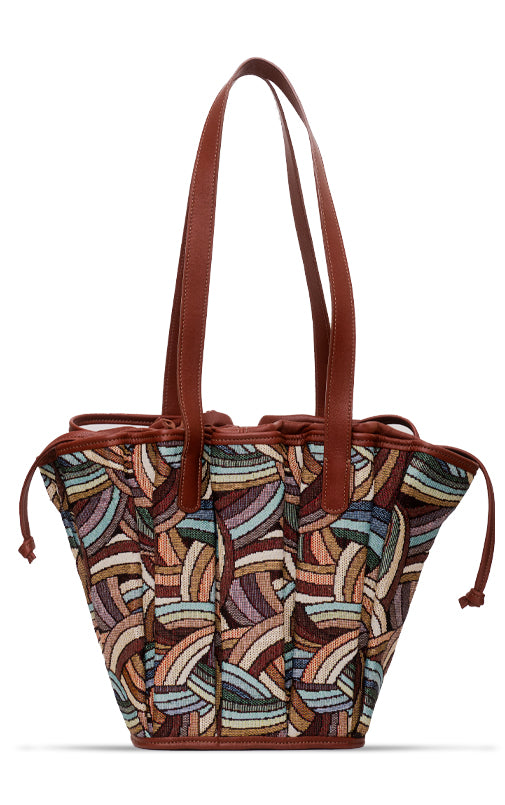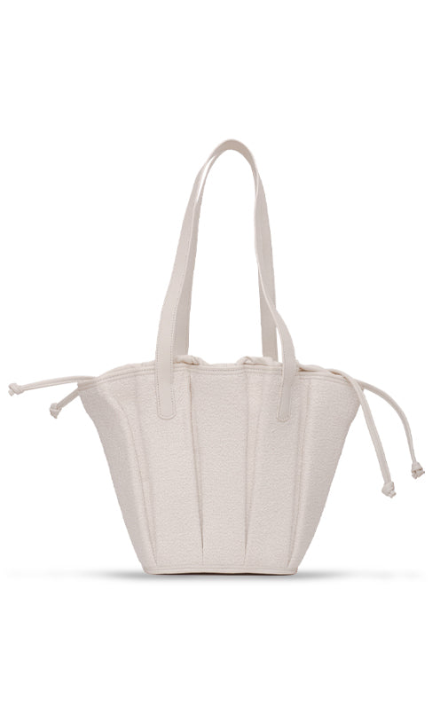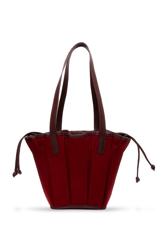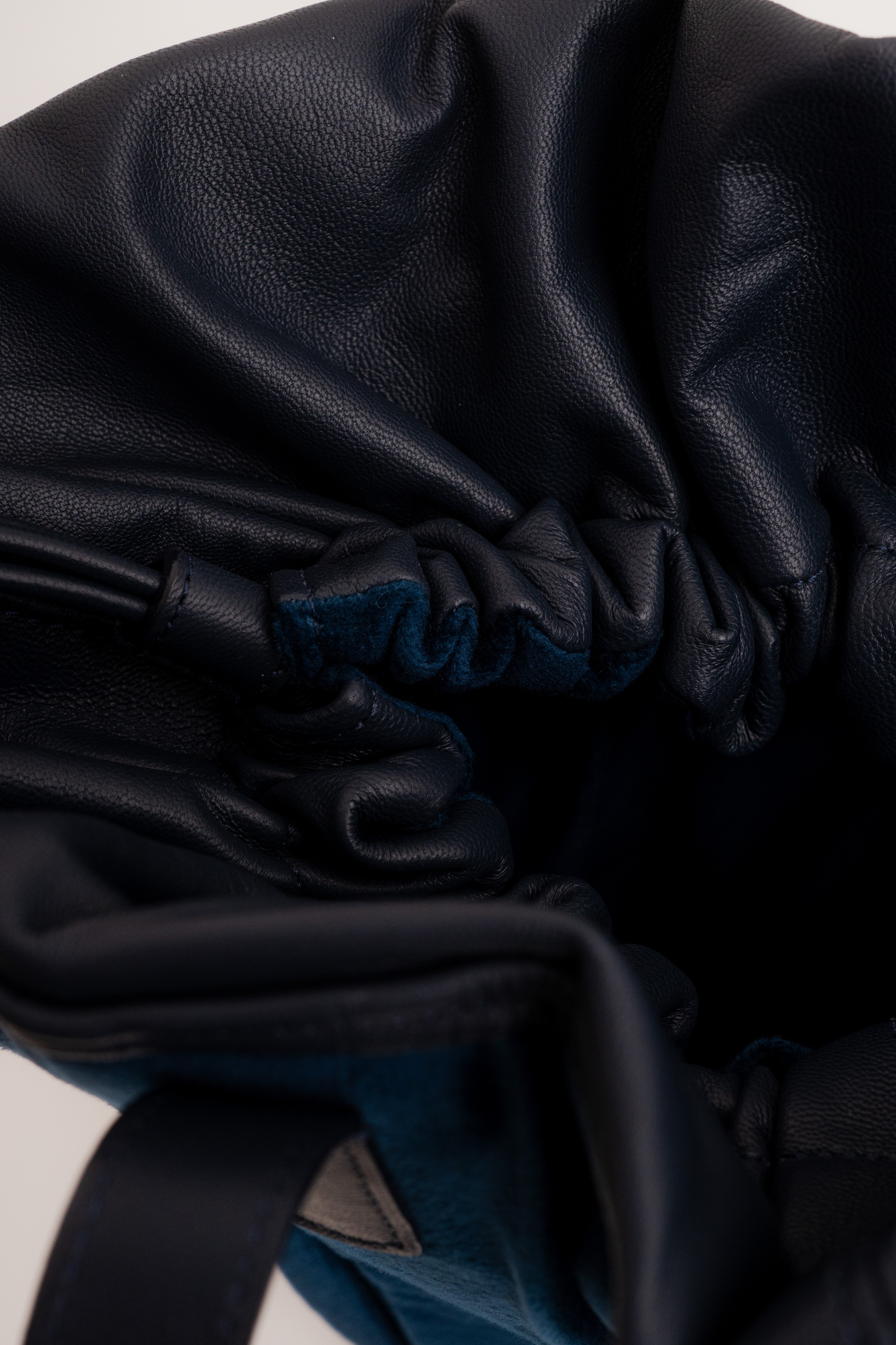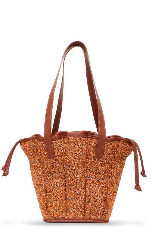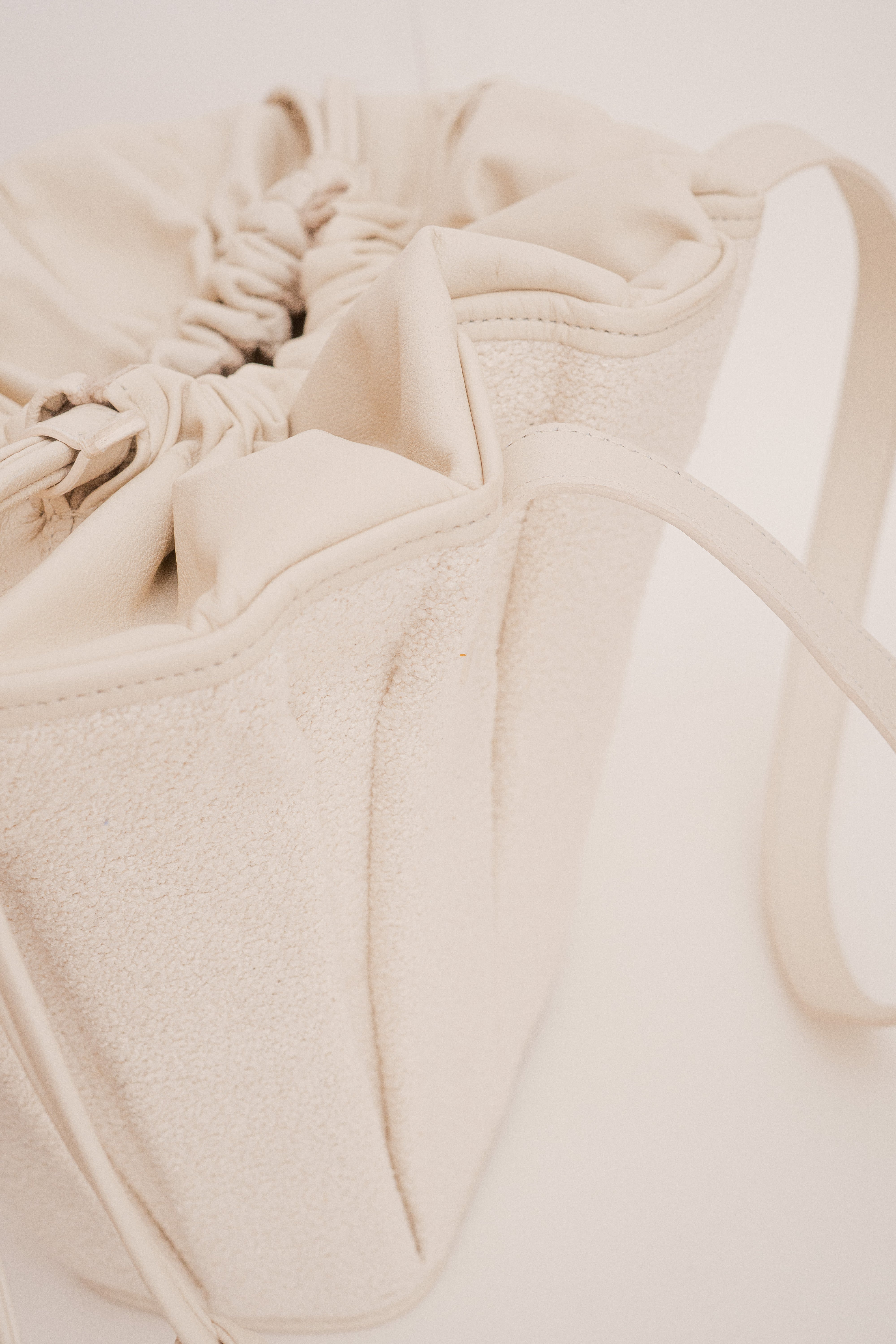 A bolsa Space possui um formato que lembra um pequeno guarda-chuva devido ao trabalho feito `a mão de dobradura. É uma peça sofisticada devido a mistura de materiais nobres e também extremamente criativa.