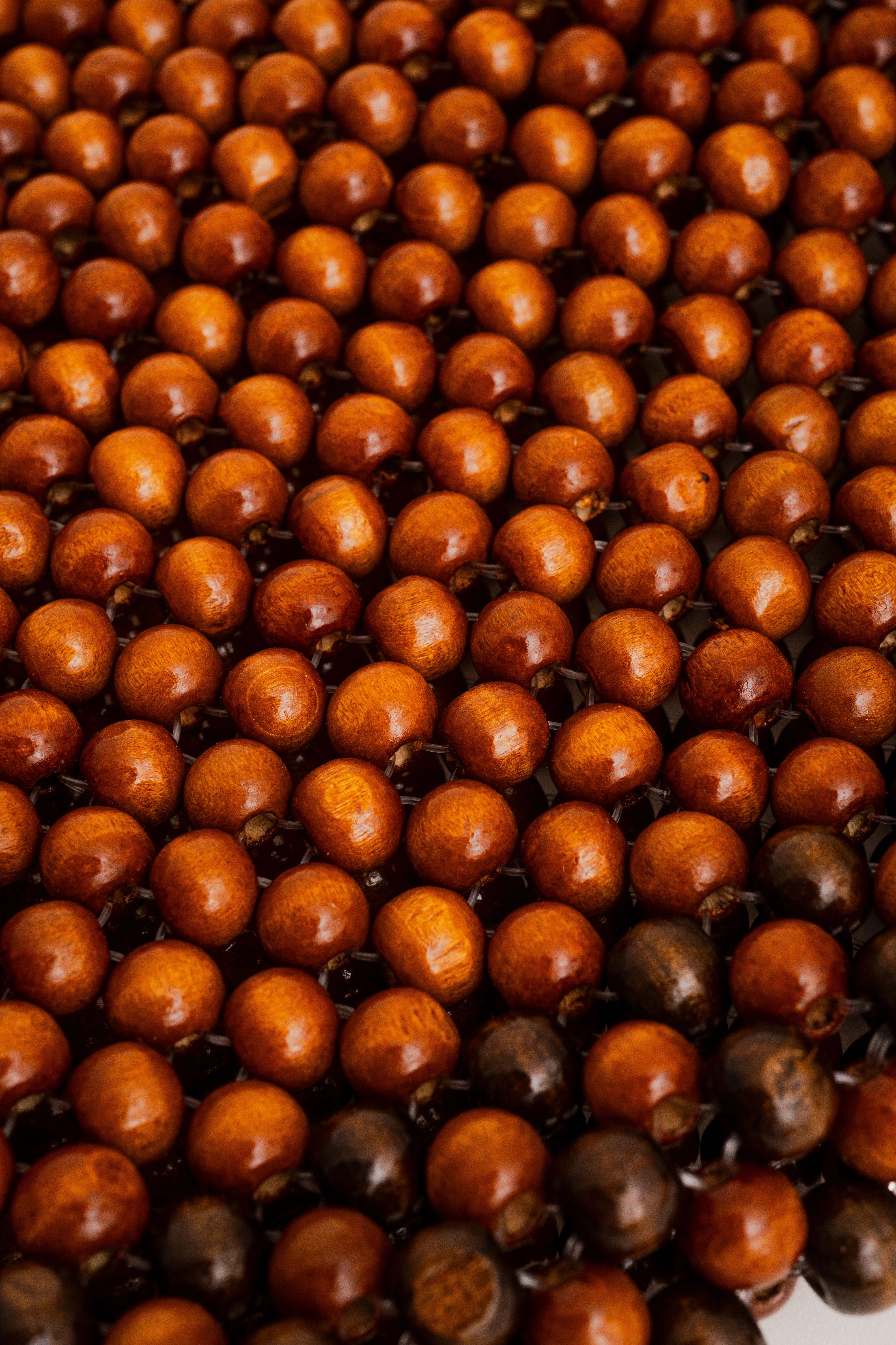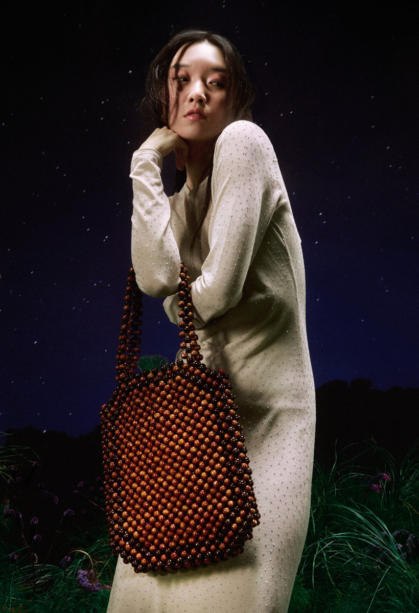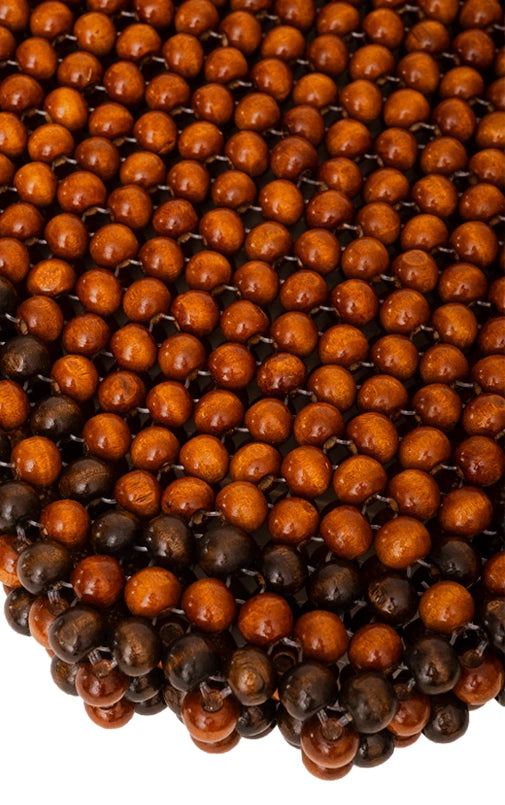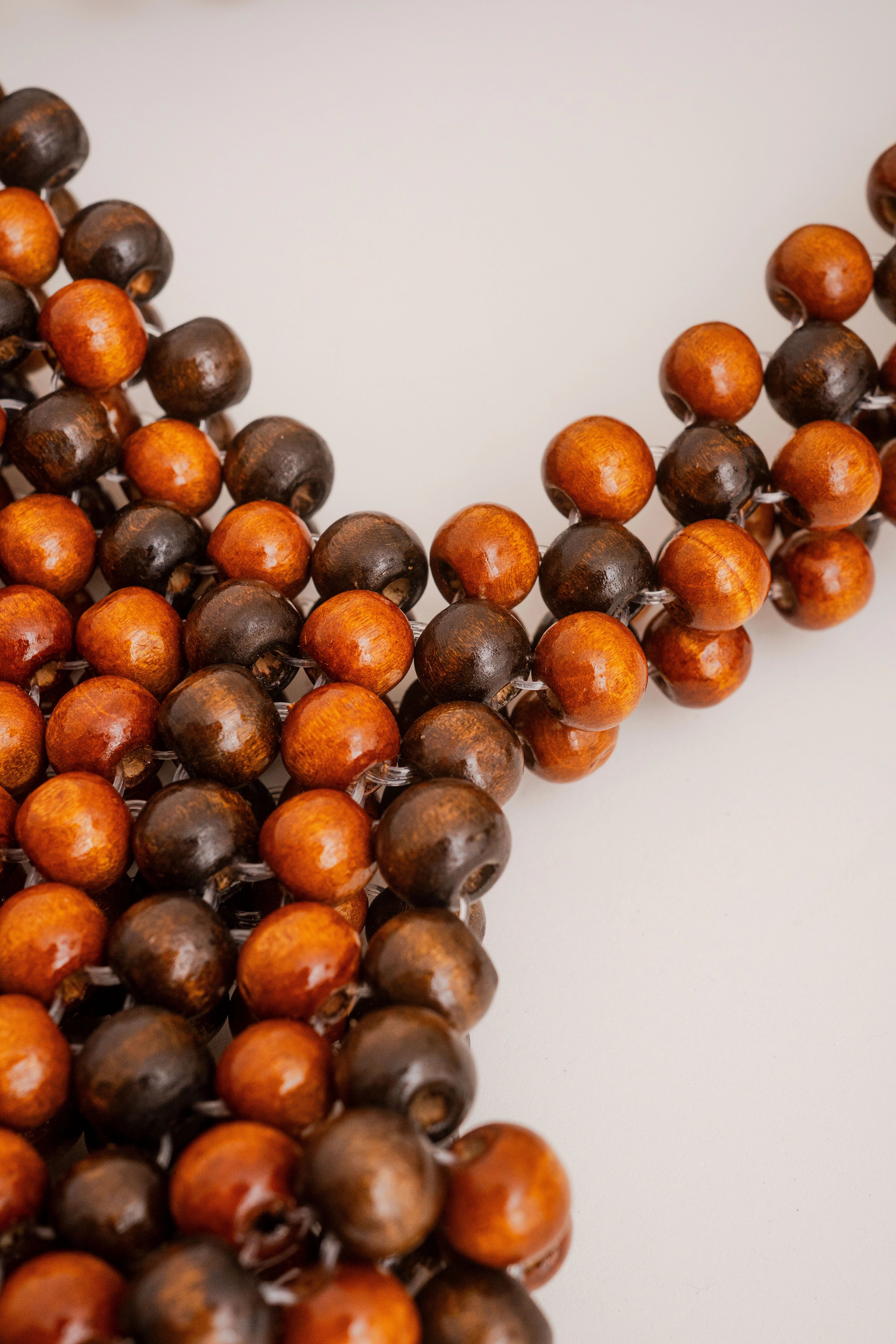 A bolsa terra foi desenvolvida a partir de contas de madeira. A rusticidade do material encontra-se com a modernidade do formato da peça que se torna única.