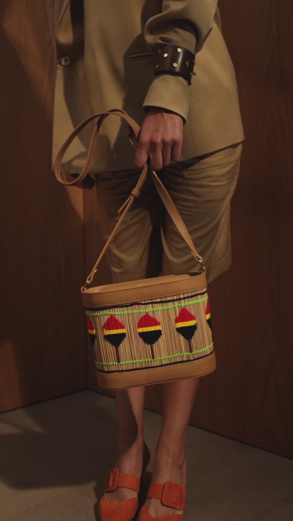 A Bolsa Tuahi foi criada a partir do trabalho manual indígena da palha de Buriti. O acabamento em couro legítimo sustenta o shape da bolsa e realça a textura natural da palha.