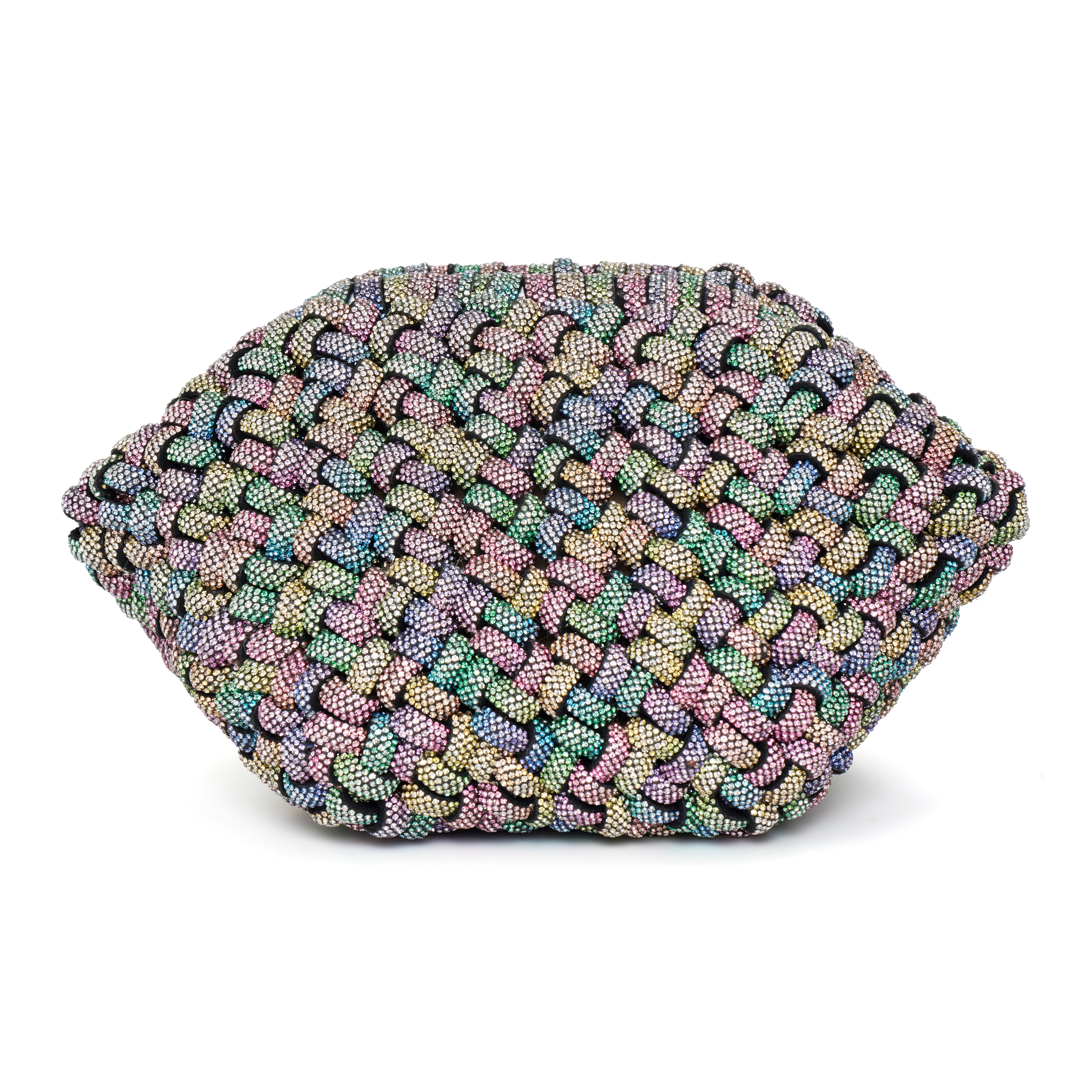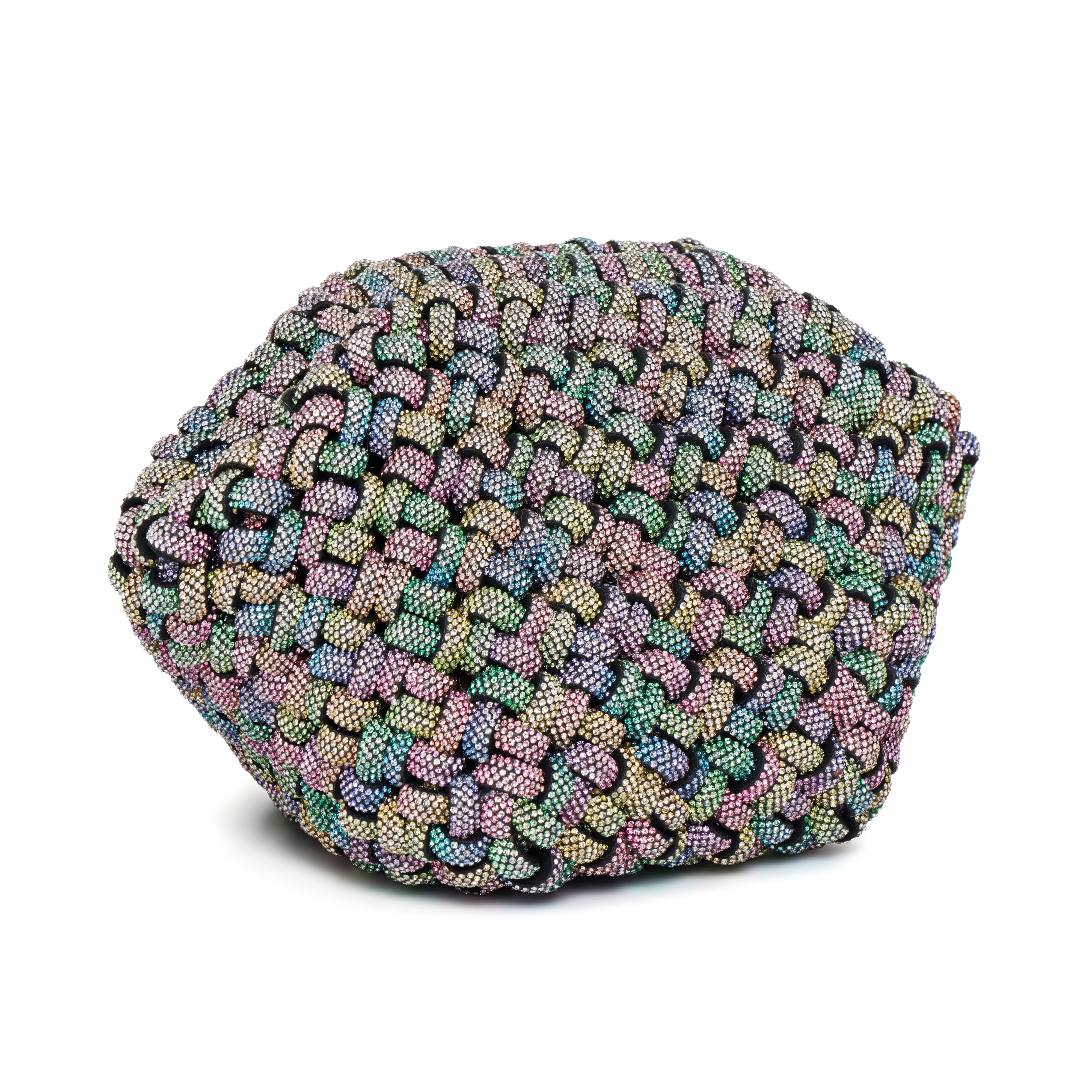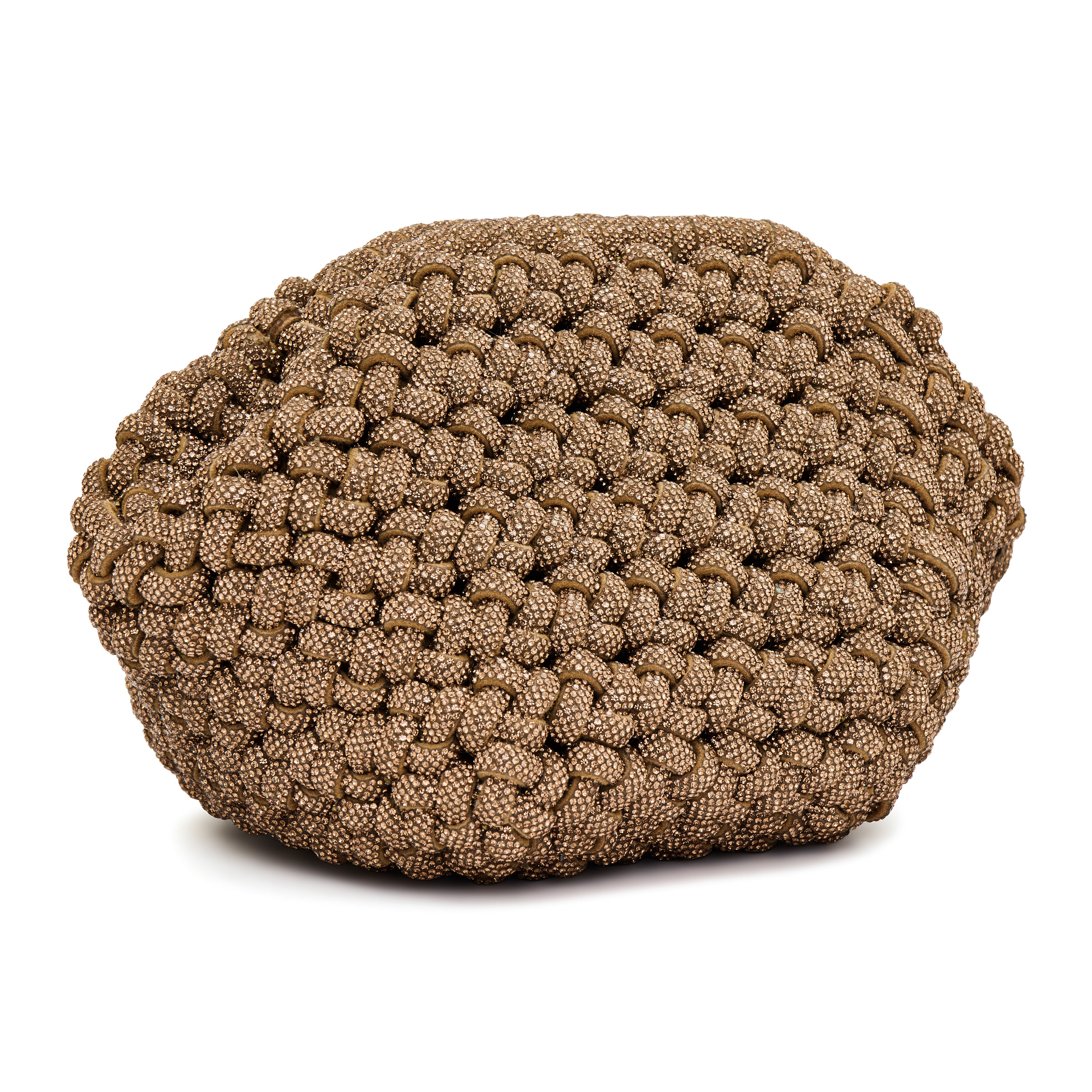 A clutch Iner é peça statement da Mil Linhas. A bolsa apresenta pequenos nós feitos à mão com fios de cristais preciosos forrados em suede. Uma verdadeira jóia.
